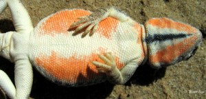 Flipping over exposes bright orange patches on the throat and belly, which only the females develop during the breeding season (the male belly and throat remain white). Flipping over and showing a bright orange belly leaves females obvious and vulnerable to predators such as birds of prey. So why did the orange patches and odd behaviour of female Lake Eyre dragons evolve?